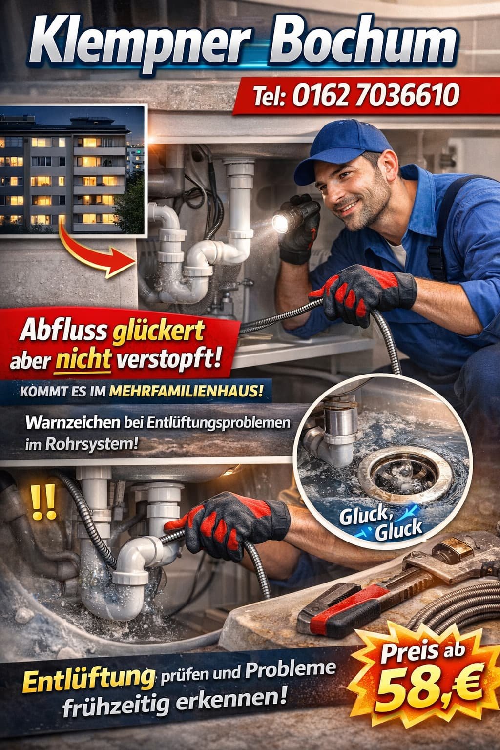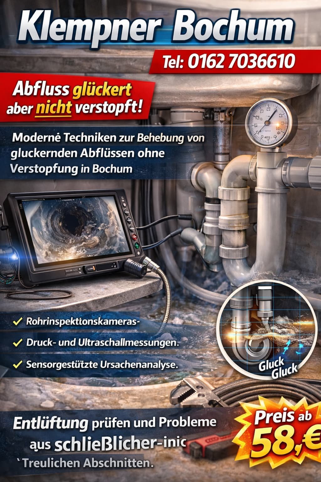 Die Kosten beginnen in der Regel ab 58 €, abhängig vom Aufwand. Bei komplexeren Fällen, etwa wenn abfluss gluckert keine verstopfung durch defekte Entlüftungen ausgelöst wird, kann der Preis ansteigen.